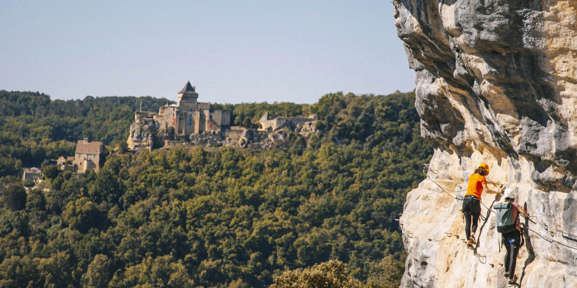 Aussitôt revenu à la surface, pourquoi ne pas enfourcher celui qui va devenir votre fidèle destrier pendant quelques kilomètres. Savourez les paysages millénaires du Périgord qui défilent sous vos yeux ! Une fois les deux pieds à terre, enfilez votre baudrier. Un moniteur vous attend pour un cours d’escalade qui vous mène tout en haut de la falaise. Prenez de la hauteur pour un point de vue panoramique. Un peu plus bas, retrouvez la via ferrata. Et pourquoi ne pas terminer en journée en défiant à la tyrolienne qui vous plonge dans la forêt !