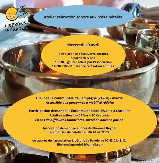 L'association Libérons La Parole invite petit-e-s et grand-e-s à embarquer pour la relaxation sonore aux bols tibétains le mercredi 29 avril à Campagne.